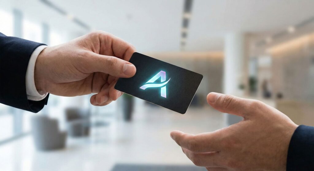 การส่งต่อนามบัตรที่มีผลงานการออกแบบโลโก้รูปตัว A สไตล์โมเดิร์น สื่อถึงการสร้างความประทับใจแรกพบให้กับลูกค้า
